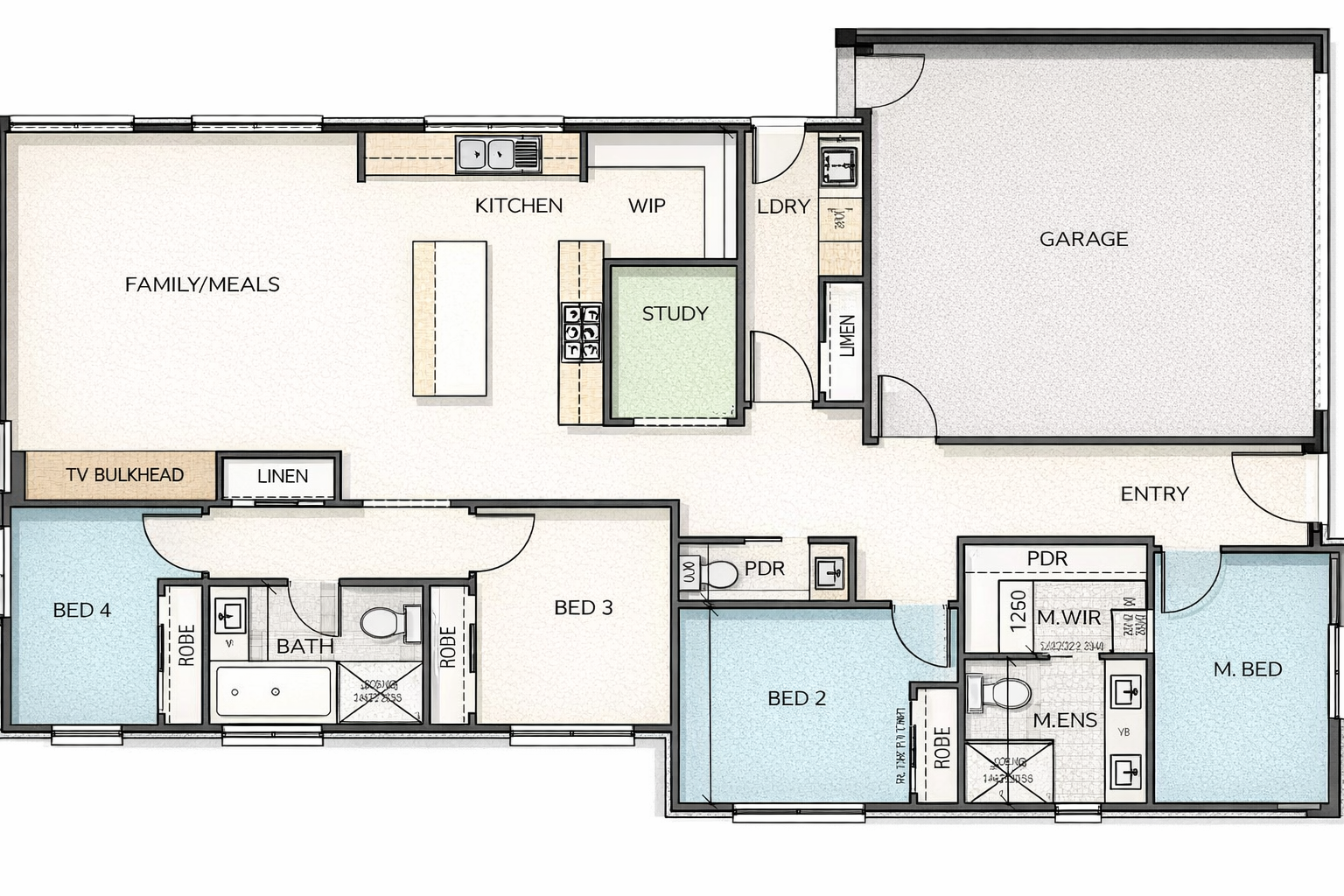 Designed for modern family living, the attached floor plan highlights a smart balance of open-plan living and private retreat zones. The heart of the home features a spacious open-plan family and meals area, seamlessly connected to a contemporary central kitchen with walk-in pantry, generous bench space and excellent flow for everyday living and entertaining.